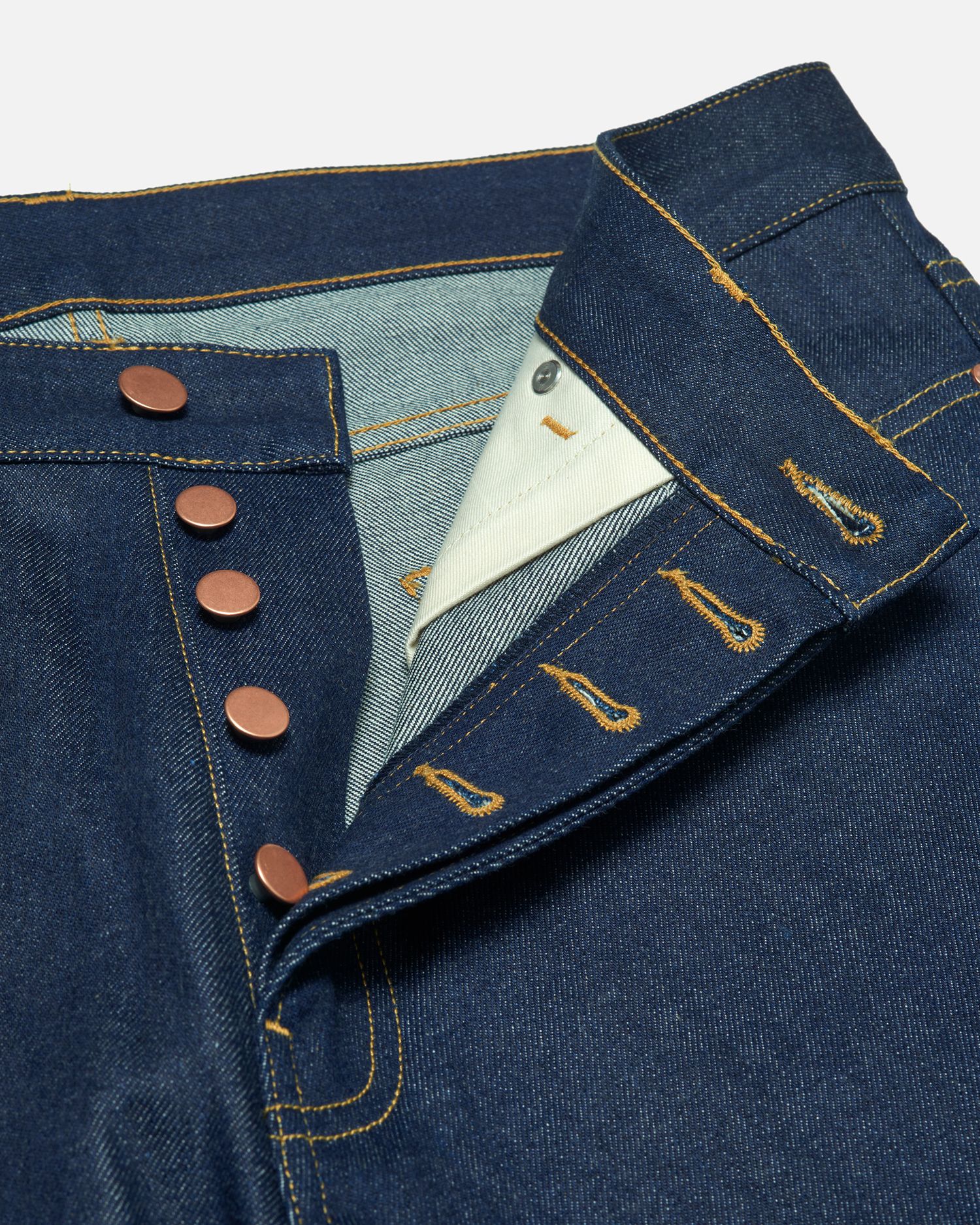 Our Classic Jeans have a mid rise with a cropped and tapered leg for a modern cut from the seat through the ankle. Constructed from 100% selvedge British denim and cut with a loosely tapered silhouette. The jeans are a classic 5 pocket finish.