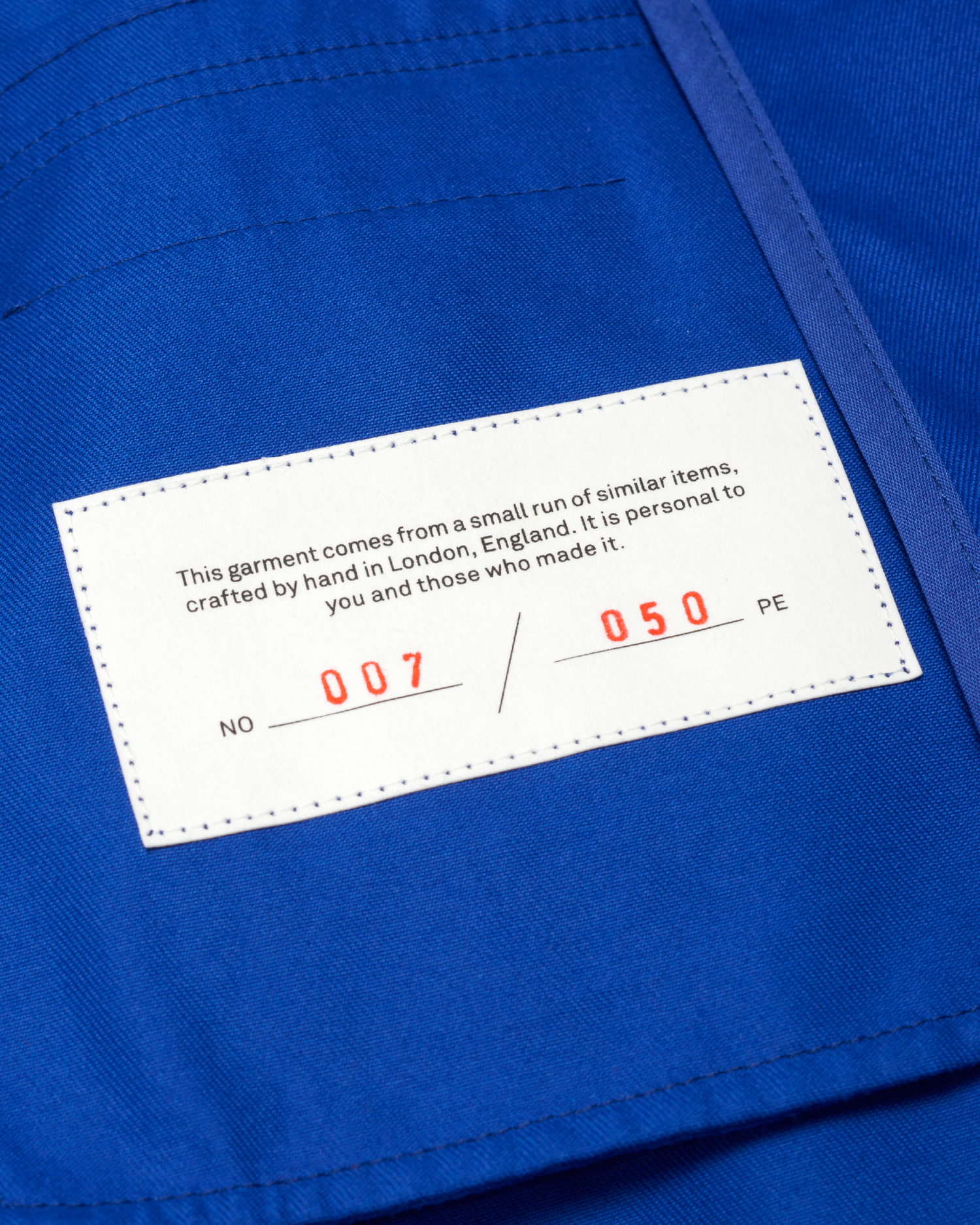 “This garment comes from a small run of similar items, crafted by hand in London, England. It is personal to you and those who made it.”