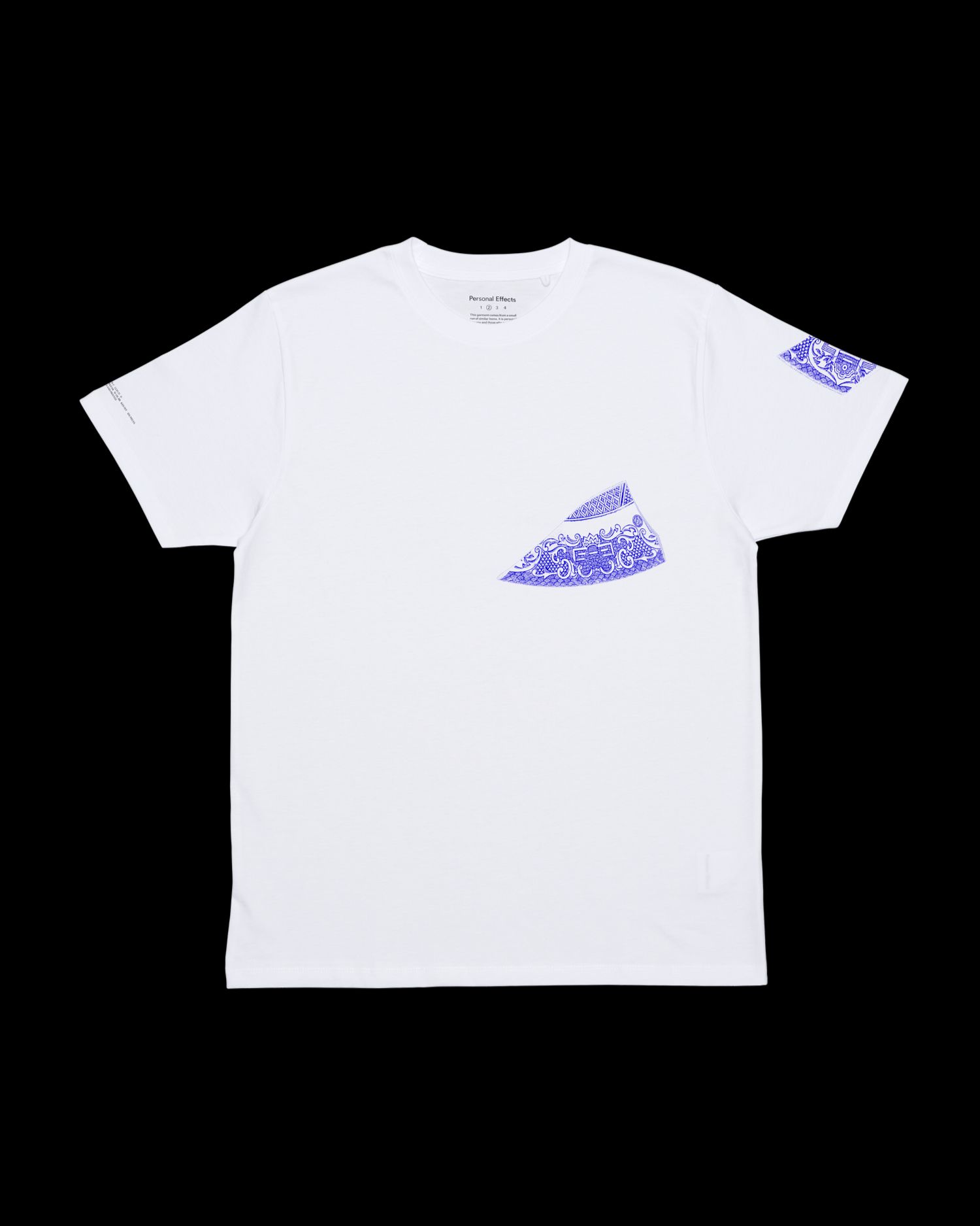 The first in the range is a beautiful English made china plate that was broken in transit. The broken pieces are now adorned across this t-shirt as the first item in the collection.