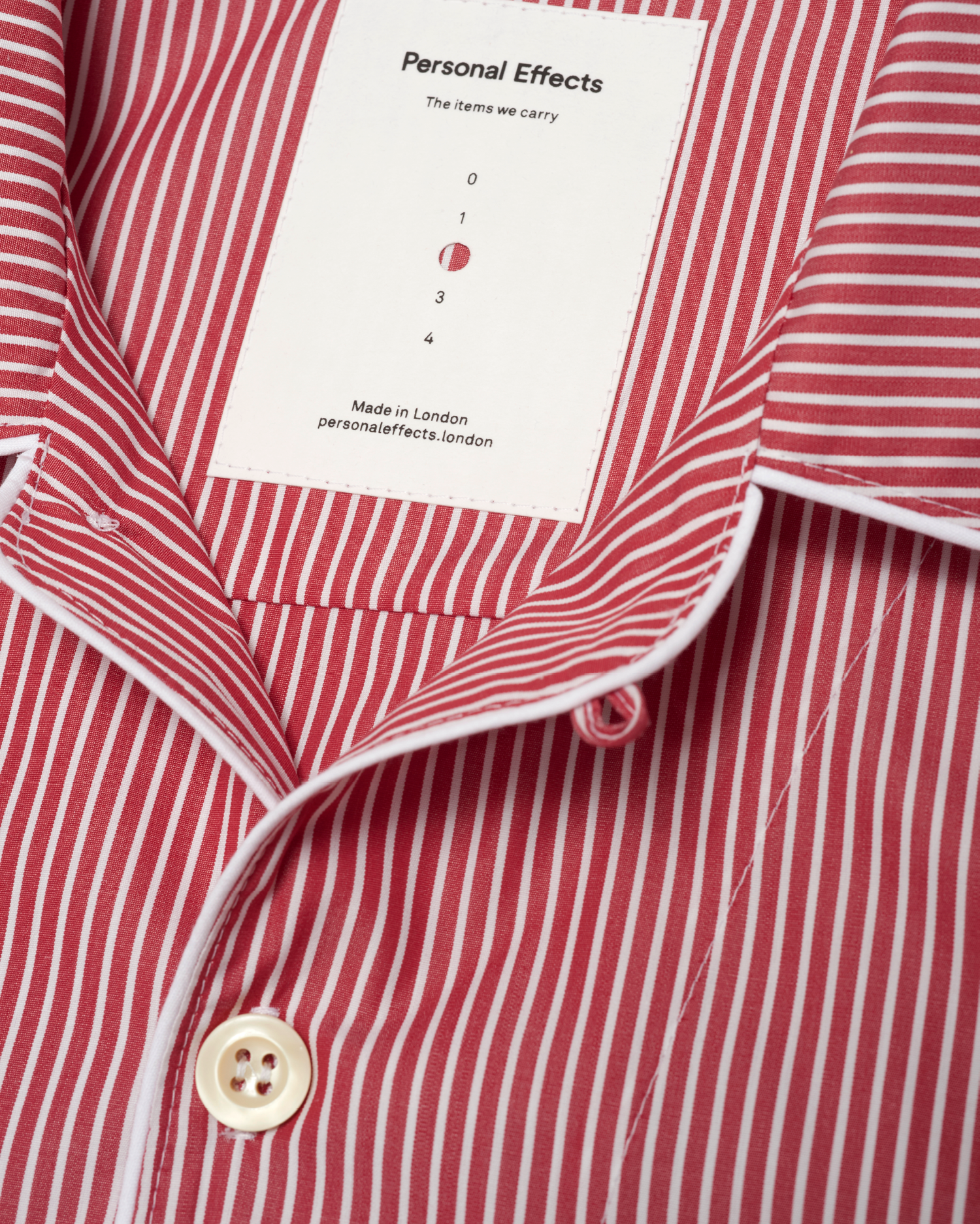Introducing the Topper Shirt, woven with red candy cane stripes and fitted with a relaxed pyjama collar. The shirt features one breast patch pocket and is finished with white cotton piping.